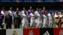 Madrid, May 30 (EFE), (Camera: Juan Yagüe).- Real Madrid signed a sponsorship deal with Emirates airlines for the next five year, during which the team will be wearing the company's logo on their shirts. Club president Florentino Perez signed the contract in the Santiago Bernabeu on Thursday, ending the club's six year union with former sponsors Bwin. <br /><br />Shiekh Ahmed bin Saeed Al Maktoum was also present at the event in which Iker Casillas, Karim Benzema, Cristiano Ronaldo and Sergio Ramos all posed with the shirt. <br /><br />SHOTLIST: FOOTAGE OF REAL MADRID CONTRACT SIGNING WITH PLAYERS POSING WITH NEW SHIRTS AND SOUND BITES OF FLORENTINO PEREZ (00:01 to 03:25). <br /><br />EFE TV -Madrid- 17:20 GMT. <br /><br />Keywords: efe-real-madrid-soccer-football-emirates. <br /><br />Tel: +34 913 467 200. <br /><br />E-mail: tvefe@efe.es. <br /><br />Web: www.efeservicios.com <br /><br /><br /><br />© EFE 2013. Está expresamente prohibida la redistribución y la redifusión de todo o parte de los contenidos de los servicios de Efe, sin previo y