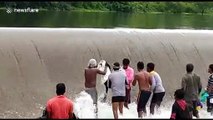 Indian villagers take advantage of flood waters to easily scoop up fish
