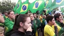 Puxados por um carro de som, passeata avança pelo Centro do Rio cantando o Hino Nacional. Cartazes destacam as reivindicações, como a rejeição à PEC 37 e o repúdio à corrupção.