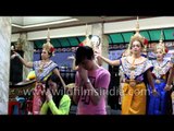 Thai dancers performing the classical dance of Thai at Erawan Shrine in Bangkok, who are hired by worshipers in return for seeing their prayers at the shrine answered.<br /><br />The Erawan Shrine is a Hindu shrine in Bangkok, Thailand, that houses a statue of Phra Phrom, the Thai representation of the Hindu creation god Brahma. A popular tourist attraction, it often features performances by resident Thai dance troupes. On 21 March 2006, a man vandalised the shrine and was killed by bystanders. However, two months after the incident a new Brahma statue was completed and placed in the shrine on 21 May 2006.<br /><br />The shrine is located by the Grand Hyatt Erawan Hotel, at the Ratchaprasong intersection of Ratchadamri Road in Pathum Wan district, Bangkok, Thailand. It is near the Bangkok Skytrain's Chitlom Station, which has an elevated walkway overlooking the shrine. The area has many shopping malls nearby, including Gaysorn, CentralWorld and Amarin Plaza.<br /><br />The Erawan Shrine was built in 1956 as part of the government-owned Erawan Hotel to eliminate the bad karma believed caused by laying the foundations on the wrong date.<br /><br />The hotel's construction was delayed by a series of mishaps, including cost overruns, injuries to laborers, and the loss of a shipload of Italian marble intended for the building. Furthermore, the Ratchaprasong Intersection had once been used to put criminals on public display.<br /><br />An astrologer advised building the shrine to counter the negative influences. The Brahma statue was designed and built by the Department of Fine Arts and enshrined on 9 November 1956. The hotel's construction thereafter proceeded without further incident. In 1987, the hotel was demolished and the site used for the Grand Hyatt Erawan Hotel.<br /><br />Source - Wikipedia<br /><br />This footage is part of the professionally-shot broadcast stock footage archive of Wilderness Films India Ltd., the largest collection of HD imagery from South Asia. The Wilderness Films India collection comprises of tens of thousands of hours of high quality broadcast imagery, mostly shot on HDCAM 1080i High Definition, HDV and XDCAM. Write to us for licensing this footage on a broadcast format, for use in your production! We are happy to be commissioned to film for you or else provide you with broadcast crewing and production solutions across South Asia. We pride ourselves in bringing the best of India and South Asia to the world... Reach us at wfi @ vsnl.com and admin@wildfilmsindia.com.