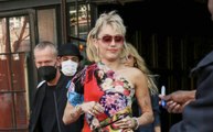 Miley Cyrus sale bajo la lluvia en Nueva York luciendo dos colitas en su pelo, y un traje blanco diminuto.
