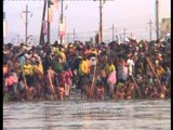 Triveni Sangam is the 'confluence' of three rivers. The point of confluence is a sacred place for Hindus. A bath here is said to wash away all of one's sins and free one from the cycle of rebirth. Triveni Sangam, in Prayag (Allahabad) has two physical rivers Ganges, Yamuna, and the invisible or mythic Saraswati River. The site is in Prayag, India.<br /><br />Allahabad built on a very ancient site of the Aryans formerly known as Prayag, is located at the junction of the holy rivers Ganga and the Yamuna. The city acquired its present name in 1 largest religious gathering in the world, is held every 12 years at the confluence of the holy rivers attracting millions of Hindu devotees. This historically famous city was a centre of the Indian Independence movement and the home of the Nehru family. Today Allahabad is a rapidly growing commercial and administrative city in Uttar Pradesh.<br /><br />Source: http://www.thecolorsofindia.com/kumbh-mela/ardh-kumbh-mela.html<br /><br />This footage is part of the professionally-shot broadcast stock footage archive of Wilderness Films India Ltd., the largest collection of HD imagery from South Asia. The Wilderness Films India collection comprises of tens of thousands of hours of high quality broadcast imagery, mostly shot on HDCAM / SR 1080i High Definition, Alexa, SR, HDV and XDCAM. Write to us for licensing this footage on a broadcast format, for use in your production! We are happy to be commissioned to film for you or else provide you with broadcast crewing and production solutions across South Asia. We pride ourselves in bringing the best of India and South Asia to the world... Reach us at rupindang @ gmail . com and admin@wildfilmsindia.com.