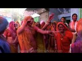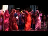 A group of women in Rajasthan dances during Holi celebration. The folk dances performed by these women will provide you a glimpse of the rich culture of Rajasthan. In Rajasthan holi is celebrated on a scale involving the entire state.<br /><br />Holi is a religious spring festival celebrated by Hindus, as a festival of colours. It is one of the major festivals of India, celebrated with enthusiasm and gaiety on the full moon day in the month of Phalgun which is the month of March as per the Gregorian calendar. It is primarily observed in India and Nepal. It is observed by the minority Hindus in Bangladesh and Pakistan as well in countries with large Indic diaspora populations following Hinduism, such as Suriname, Malaysia, Guyana, South Africa, Trinidad and Tobago, the United Kingdom, the United States, Mauritius, and Fiji. Holi festival may be celebrated with various names and people of different states might be following different traditions. But, what makes Holi so unique and special is the spirit of it which remains the same throughout the country and even across the globe, wherever it is celebrated. <br /><br />Every year, thousands of Hindus participate in the Holi festival. The festival has many purposes. First and foremost, it celebrates the beginning of the new season, spring. Originally, it was a festival that commemorated good harvests and the fertile land. Hindus believe it is a time of enjoying spring's abundant colors and saying farewell to winter. It also has a religious purpose, commemorating events present in Hindu mythology. During this event, participants hold a bonfire, throw colored powder at each other, and celebrate wildly. Entire country wears a festive look when it is time for Holi celebration. Market places get abuzz with activity as frenzied shoppers start making preparations for the festival. Heaps of various hues of gulal and abeer can be seen on the roadside days before the festival. <br /><br />Pichkaris in innovative and modern design too come up every year to lure the children who wish to collect them as Holi memorabilia and of course, to drench everybody in the town. Womenfolk too start making early preparations for the holi festival as they cook loads of gujiya, mathri and papri for the family and also for the relatives. At some places specially in the north women also make papads and potato chips at this time.<br /><br />Great excitement can be seen in people on the next day when it is actually the time for the play of colours. Shops and offices remain closed for the day and people get all the time to get crazy and whacky. Bright colours of gulal and abeer fill the air and people take turns in pouring colour water over each other. Children take special delight in spraying colours on one another with their pichkaris and throwing water balloons and passersby. Women and senior citizen form groups called tolis and move in colonies - applying colours and exchanging greetings. Songs, dance on the rhythm of dholak and mouth-watering Holi delicacies are the other highlights of the day. Lovers too apply colours on their beloved. This has a popular legend behind it. It is said that the naughty and mischievous Lord Krishna started the trend of playing colours. He applied colour on her beloved Radha to make her one like him. The trend soon gained popularity amongst the masses. <br /><br />There is also a tradition of consuming the very intoxicating bhang on this day to further enhance the spirit of Holi. It is so much fun to watch the otherwise sober people making a clown of themselves in full public display. Some, however, take bhang in excess and spoil the spirit. Caution should therefore be taken while consuming bhang delicacies. After a funfilled and exciting day, the evenings the spent in sobriety when people meet friends and relatives and exchange sweets and festive greetings. <br /><br />It is said the spirit of Holi encourages the feeling of brotherhood in society and even the enemies turn friend on this day. People of all communities and even religions participate in this joyous and colouful festival and strenthen the secular fabric of the nation.<br /><br />Source: http://www.holifestival.org & Wikipedia<br /><br />This footage is part of the professionally-shot broadcast stock footage archive of Wilderness Films India Ltd., the largest collection of HD imagery from South Asia. The Wilderness Films India collection comprises of tens of thousands of hours of high quality broadcast imagery, mostly shot on HDCAM 1080i High Definition, HDV and XDCAM. Write to us for licensing this footage on a broadcast format, for use in your production! We are happy to be commissioned to film for you or else provide you with broadcast crewing and production solutions across South Asia. We pride ourselves in bringing the best of India and South Asia to the world... Reach us at wfi @ vsnl.com and admin@wildfilmsindia.com.