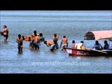 The Ganges, also Ganga, is a trans-boundary river of India and Bangladesh. The 2,525 km (1,569 mi) river rises in the western Himalayas in the Indian state of Uttarakhand, and flows south and east through the Gangetic Plain of North India into Bangladesh, where it empties into the Bay of Bengal. It is the second largest river in the World by discharge. The Ganges basin is the most heavily populated river basin in the world, with over 400 million people and a population density of about 1,000 inhabitants per square mile (390 /km2).<br /><br />The Ganges is the most sacred river to Hindus and is also a lifeline to millions of Indians who live along its course and depend on it for their daily needs. It is worshipped as the goddess Ganga in Hinduism. It has also been important historically: many former provincial or imperial capitals have been located on its banks.<br /><br />Source : Wikipedia<br /><br />This footage is part of the professionally-shot broadcast stock footage archive of Wilderness Films India Ltd., the largest collection of HD imagery from South Asia. The Wilderness Films India collection comprises of tens of thousands of hours of high quality broadcast imagery, mostly shot on HDCAM / SR 1080i High Definition, Alexa, SR, HDV and XDCAM. Write to us for licensing this footage on a broadcast format, for use in your production! We are happy to be commissioned to film for you or else provide you with broadcast crewing and production solutions across South Asia. We pride ourselves in bringing the best of India and South Asia to the world... Reach us at rupindang @ gmail . com and admin@wildfilmsindia.com.