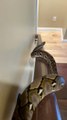 Un perroquet glisse sur une rampe d'escalier