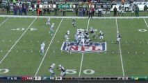 New York Jets quarterback Matt Simms fumbles attempting to handoff to running back Bilal Powell. The football is recovered by Miami Dolphins linebacker Philip Wheeler and returned for no gain.