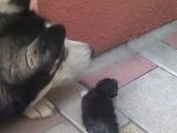 A dog owner gives his silver Husky a head massage with a wire massager. At first the dog doesn’t know what it is and is a little freaked out. But once it’s in place on his head, it’s oooh so good. Yaaaa, that’s the spot!