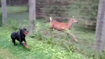 Reh spielt mit einem Rottweiler