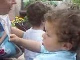 dylan petit rigole dans sa chaise avec sa tata