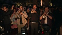 Trumpet players perform national anthem outside palace