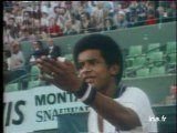 Roland MAGDANE, chemise noire, bretelles blanches, cravate blanche à pois noirs, gants blancs, interprète le sketch "L'épicier".