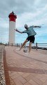 Man Performs Freestyle Soccer Dribble Near Lighthouse