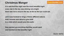 (12/13/12) <br /> <br />Underneath the moonless sky, the Christmas <br />Star caught my eye. <br />Every year it comes into plain sight <br />At the stroke of midnight. <br /> <br />To remind us of the birth of his son <br />The one and only one. <br />He was sent to earth to take away the sins of man <br />For humanity needed a helping hand. <br /> <br />He was born in a manger in Bethlehem <br />When the star first shone then. <br />It lit up the sky so clear and bright <br />And stayed that way throughout the night. <br /> <br />The choir of angels began to sing <br />As they praised the new born king. <br />The kings had traveled very far <br />Following this Christmas star. <br /> <br />When they arrived - there he laid <br />In a manger which was covered with hay. <br />Joseph and Mary kneeling by his side <br />As his eyes opened wide. <br /> <br />Acknowledging the three kings <br />And the gifts they did bring. <br />Since then we celebrate the birth of Christ <br />As gifts are given out that night. <br /> <br />© L. RAMS<br /><br />louis rams<br /><br />http://www.poemhunter.com/poem/christmas-star-of-bethlehem/