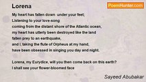 O my Lorena, <br />You I miss; <br />Give me kiss. <br />I want to give you <br />Morning dew, <br />Love and peace. <br /> <br />O my Dove <br />Beautiful, <br />O my Love <br />Warm and cool, <br />I want you to take <br />To love-lake, <br />To love-beach. <br /> <br />Every day <br />Every night <br />To get you <br />I do fight. <br />I want to gain you, <br />Obtain you, <br />You to reach. <br /> <br />2. <br />I have made, <br />Lorena, <br />A love-bed, <br />Lorena; <br />Won't you come <br />To stay there <br />Forever? <br /> <br />The bed is <br />made of peace; <br />There we will <br />hug and kiss; <br />When I will <br />play love-game, <br />Your face will <br />become red, <br />Lorena. <br /> <br /> <br />This bed is <br />made of light; <br />There will pass <br />day and night; <br />When you feel <br />tired, o Love, <br />On my arms <br />keep your head, <br />Lorena. <br /> <br />3. <br />I do love you, <br /> I do you love you, <br /> Lorena. <br />You are my Moon, <br /> My song-dove you, <br /> Lorena.<br /><br />Sayeed Abubakar<br /><br />http://www.poemhunter.com/poem/songs-for-lorena/
