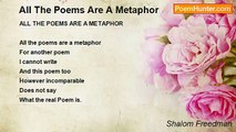 The poems became metaphors- <br />They took off like meteors, <br />They turned into shimmering white almond tree beauty- <br />They danced- <br />They went home <br />They became sick and died- <br />They did everything a human being and a non- human being could try to do - <br />They were nothing and they were everything- <br />They turned the sky white and blue on its darkest day <br />And made the nights green- <br />Oh they were something else the poems when they became metaphors- <br />And still now, <br />They are rising up and going deep into a different universe, <br />No one not even the most quiet eyes can ever fully dream-<br /><br />Shalom Freedman<br /><br />http://www.poemhunter.com/poem/the-poems-became-metaphors/