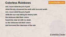 Lady Juggernaut said she's going home <br />Along with the tortoise shell shaped like dome <br />'I have done what needs to be done.', said she <br />'Now, I have to be where I have to be.' <br />But I know she lied, I know she lied <br />The eyes cannot conceal what the lips could hide <br />In the warmth of her face I could see the snow <br />I know she knows she got nowhere to go. <br />And there she is sitting still in a little boat <br />Watching the ripples as it stayed afloat <br />She envies the waves which on the shaft did break <br />She envies the violence which made the little boat shake.<br /><br />Estrellita Dedel<br /><br />http://www.poemhunter.com/poem/lady-juggernaut/