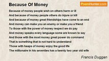 Due to money good friendships have come to an end <br />For money can make an enemy out of a friend <br />And due to money many are serving prison time <br />For money or lack of it leads many to serious crime <br />Due to money the Fifth Commandment has often been broken it does seem sad to say <br />That some with their lives due to money do pay <br />Those who say money is not important to reality not true <br />If you owe someone a lot of money for Court you are due <br />Whoever say money is not important believe their own lie <br />People have been bashed over money and left there to die <br />And people due to money feel happy to deceive <br />And that it does speak every language you ought to believe <br />Yes money out of a friend can make a foe <br />I am telling you something you already know.<br /><br />Francis Duggan<br /><br />http://www.poemhunter.com/poem/due-to-money/