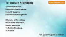 A cycas plant and a coconut plant, <br />Grown together in a nursery, <br />Were transplanted severally. <br />They grew to different heights in due course. <br />It was the dwarf cycas which had been proud <br />To say that the coconut tree was his play mate. <br /> <br />A mango seed and a banyan seed, <br />Sown and watered in a germination bed, <br />Were transplanted severally. <br />They grew to different shapes in due course <br />It was the little mango which was proud <br />That the banyan tree her nursery mate. <br />04.02.2009<br /><br />Rm.Shanmugam Chettiar.<br /><br />http://www.poemhunter.com/poem/the-childhood-friendship/