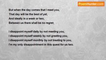 I try to please you, but never can, no matter how hard I try. <br />There is nothing, in your eyes, I can do to make you proud. It's just not possible. <br />I'm like the little partical of dust on your desk you realize fir one moment before flicking it to the ground and immeadiatly forgetting it. <br />So what's the point of being here if you're just going to push me way?<br /><br />Kayla Garner<br /><br />http://www.poemhunter.com/poem/your-only-disappointment-me/