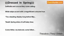 With a song of Spring in my heart <br />I embrace this day of Spring <br />The warmth replacing the Winters chill <br />And my dream that gives rise to wings; <br />Standing in the doorway of: New Beginnings <br />An ocean of possibilities await <br />Dazzled by the genius of Masters <br />I give a big welcome to Fate; <br />Breathing in the blossoms pleasant fragrance <br />A fountain of bliss in Gardens new <br />Loving the magic touch of Butterfly kisses <br />And the melodies of SongBirds in view; <br />With a song of Spring in my heart <br />I continue to embrace this day <br />Ever grateful for the blue skies and sun <br />For the flowers and hope of sweet May! ; <br /> <br /> <br /> <br />By: Theodora Onken <br /> <br /> <br />May,1,2012<br /><br />Theodora (Theo) Onken<br /><br />http://www.poemhunter.com/poem/song-of-spring-3/