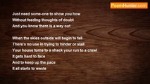 The sky may be too high for me to reach <br />But I wouldn't like the feel of it anyway <br />The ones who say your obliged to teach <br />Do not have any knowledge to give away <br /> <br />The floor may be right beneath my feet <br />But I'm given the chance to fly away <br />Now me and the sky are about to meet <br />I wonder if it'll make me want to stay <br /> <br />The lack of air makes it hard to breath <br />The clouds look soft but feel like ocean spray <br />The fall to come makes it hard to leave <br />But soon the clouds would become dark and grey <br /> <br />As I finaly hit the floor once again <br />The clouds thicken and trees begin to sway <br />As i realise I'm still in the pouring rain <br />I should've gone in the direction I'm about to pray<br /><br />Liam Hughes<br /><br />http://www.poemhunter.com/poem/the-rise-and-fall-2/