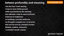 “Does it have a meaning? ” <br />they ask. He answers them with gall. <br />“I hope it doesn’t, but it will occur again, <br />and you will see once more what happened then, <br />as surely as the leaves that fall <br />when browning follows greening. <br />Men are like trees, the Bible says, <br />doomed sans divine majestic lèse.” <br /> <br /> <br />Richard Eder reviews 'Preempting the Holocaust, ' by Lawrence L. Langer (Yale University Press) in a book review in the LA Times (November 22,1998) . He quotes Raul Hilberg who, when asked whether the Holocaust had any meaning, answered: “I hope not.” <br /> <br /> <br />11/22/98 <br /><br />gershon hepner<br /><br />http://www.poemhunter.com/poem/does-it-haae-a-meaning/