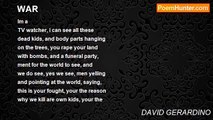 THERES a war going on, <br />theres a war in me, <br />times are changing, like the color <br />of the sea. <br />THERES a lady that i <br />used to know, gonna die <br />soon, or so im told, <br />but they want listen to me, no they <br />want be able to see, a little distruction, <br />coming down on me. <br />THERES a war going on, <br />theres a war on these <br />streets, peaple laughing, peaple crying, <br />peaple killing for peace, <br />theres a lady i use to know, <br />gonna die soon, or so im told. <br />but they want listen to me, no they want <br />be able to see, a little distruction, <br />coming down on me...<br /><br />DAVID GERARDINO<br /><br />http://www.poemhunter.com/poem/theres-a-war-2/