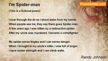 (This is a fictional poem) <br /> <br />One day a spider climbed up my leg while I was cleaning out my loft. <br />It got on my penis and I can't get it off. <br />I tried to pry it off and I even tried to remove it with soap. <br />But it's clamped on real good and I'm all out of hope. <br />It really hurts when it bites my wiener. <br />It made my girlfriend scream, you should've seen her. <br />She dumped me and found another man. <br />I want to get rid of this spider but I'm not sure if I can. <br />I'm desperate to get this spider unattached. <br />I may douse it in gasoline and light it with a match. <br />You're probably thinking that that would be insane. <br />When the good lord made me, he didn't give me a good supply of brains. <br />The spider just walked off of my wiener, that's good news. <br />But now it's attached itself to my balls, I guess I was born to lose.<br /><br />Randy Johnson<br /><br />http://www.poemhunter.com/poem/there-is-a-spider-on-my-wiener/
