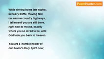Sweetheart, you were here again last night, <br />in yet another happy dream about you and me, <br />or, so I thought, until I learned a bitter lesson... <br /> <br />I saw you standing by an open kitchen window, <br />just seven feet away, in that cute strapless blouse, <br />so innocently showing me your lovely shoulders... <br /> <br />Delightfully surprised, and drawn by irresistible <br />forces, I desperately wanted to touch again <br />those beautiful silken shoulders, as in the past... <br /> <br />I never had to beg you for a hug and kiss <br />whenever I longed for intimacy with you... <br />'So, why not now again? ', I asked myself. <br /> <br />When I reached out to touch you, darling, <br />my eager fingertips felt nothing..., nothing... <br />I saw your shape, your face, your smile... <br /> <br />This time, however you were different, <br />transparent, insubstantial, although you <br />still smiled at me like in previous dreams... <br /> <br />Then, suddenly you disappeared, and <br />left me cringing, crying on my knees, <br />'My God, what have I done to her? ? ' <br /> <br />Have You been sending me her spirit <br />to lovingly, responsively touch mine, <br />but never to be physically approached? <br /> <br />My human longings and wild imagination <br />must yield to patience, gained in prayer, <br />before I'll see her blessed soul again... <br />Amen. <br /> <br />July 23,2006<br /><br />Willem VanVoorthuysen<br /><br />http://www.poemhunter.com/poem/untouchable-now/