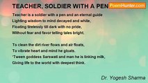 But poor patriotic soldier, at home his father lying sick; <br />His little brother and sister were reliant upon him for studies, <br />But one misty dawn he was dismissed from his job, <br />For eliminating some dreaded terrorists. <br /> <br />This darkened his peace and pleasure, <br />The brave soldier was almost mad, <br />Told his father's last remains, shouldered to crematorium; <br />Alas! Failed to see the last glimpses of his father, dear. <br /> <br />Disturbed and distracted he became, <br />Roamed through the barracks, crying: <br />Terrible nation: mad, conceited and ridiculous; <br />Suddenly I was liquidated for serving nation. <br /> <br />Life never offers same chance twice, <br />Here soldiers and traitors be the same, <br />Sun of my life is going down behind the wood, <br />Happy to wish, must be good for my dear land. <br /> <br />Tomorrow my immortal soul will again rise, <br />No hideous traitor fright my mind and eyes; <br />Sleep rests me warmly, till I wake in a new dawn, <br />And hear the victory trumpet in the lawn.<br /><br />Dr. Yogesh Sharma<br /><br />http://www.poemhunter.com/poem/a-patriotic-soldier/