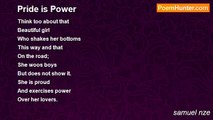 They say she understands <br />Body language better <br />Than men do <br />It's part of her power. <br /> <br />She is relationship savvy <br />Miles ahead of the guys <br />Anticipation a necessary touch <br />She knows what I wanna say. <br /> <br />It's woman power <br />This girl has a hold on me <br />She takes me by the nose <br />She holds my heart. <br /> <br />Shaggy has wondered <br />If God is a woman <br />I don't blame him <br />I wonder the same thing.<br /><br />samuel nze<br /><br />http://www.poemhunter.com/poem/woman-power/