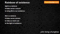 A groan still roars <br />In the private quarters <br />Of many slowly healing <br />Shattered hearts <br />Like the roar of a tempest <br />That could even dim <br />The evil spewing crashes <br />That tore down the proud symbol <br />Of American Success last autumn; <br />A dolorous cry restrained <br />But reveberates in a spasm <br />Of agony made worse in <br />The dead of night by <br />The poignant memories of <br />Loved ones' sudden demise, <br />A loss that only relentless <br />Prayers could help mend. <br />Far away, a Noah-styled rainbow <br />Crowns the sky; a heaven's <br />Promise to end pain and drain? <br />In earnest, we all pray <br />For a better tomorrow; <br />A world free from misunderstandigs, <br />Religious bigotry, riots, <br />Hypocritism, racism <br />And ruinous power struggles. <br />Has any civilisation ever <br />Really gained from these?<br /><br />john tiong chunghoo<br /><br />http://www.poemhunter.com/poem/a-rainbow/