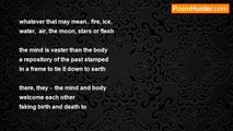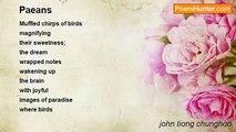 i am only <br />a part <br />of creation <br /> <br />this body <br />i am in <br />i am only <br />a part of it <br /> <br />the rest <br />i really dont <br />know what's <br />going on <br /> <br />i am <br />you know <br />only part <br />of creation <br /> <br />if creation <br />would give <br />mouths <br />to the grass <br /> <br />every blade <br />in the field <br />would decry too <br />'we own only <br />part of each other' <br />the rest, only <br />heaven knows.'<br /><br />john tiong chunghoo<br /><br />http://www.poemhunter.com/poem/part-of-it-all/