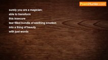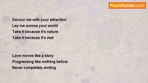 I close my eyes and retreat further into my dreams. <br />I stand before you unabashed and wanting. <br />the notes and letters of love float through the air, easily dispensed, waiting to be proved. <br />its not that I don't trust, <br />I just feel. <br />living there it becomes hard to breathe. <br />life steals me piece by piece. <br />my blue skies, filled with my dreams <br />my fields of flowers, filled with promise <br />my cool green pools of water to bathe my insecurities. <br />but I have faith that it will all be the same tomorrow. <br />I want to feel you. <br />My very own, my light. <br />guide me to peace. <br /> <br />move me. <br />hold me. <br />tell me that you are mine, <br />show me what you believe. <br /> <br />sing with me <br />laugh with me <br />tell me that you want me to be yours, <br />show me what you believe. <br /> <br />take me. <br />find me. <br />tell me that you need me, <br />show me what you believe. <br /> <br />love me. <br />come to me. <br />and show me what you believe. <br /> <br />let me borrow your hope because I can't open my eyes.<br /><br />Eila Mahima Jaipaul<br /><br />http://www.poemhunter.com/poem/show-me-what-you-believe/