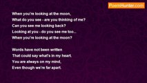 I live across the country <br />Where the sun sets on the sea. <br />We send love in our letters, <br />And create a place where we both can be. <br /> <br />Your passion touched my soul, <br />And my darkness turned to light. <br />What was once as black as coal, <br />Shines like a diamond in the night! <br /> <br />When you're looking at the moon, <br />What do you see...are you thinking of me? <br />Can you see me looking back? <br />Looking at you...do you see me too... <br />When you're looking at the moon? <br /> <br />Words have not been written <br />That could say what's in my heart. <br />You are always on my mind, <br />Even though we're far apart. <br /> <br />If I could have one dream, <br />If stars could make my wish come true, <br />I’d have you here with me, <br />And spend forever loving you. <br /> <br />When you're looking at the moon, <br />What do you see...are you thinking of me? <br />Can you see me looking back? <br />Looking at you...do you see me too... <br />When you're looking at the moon? <br /> <br />© S.E.S<br /><br />Sara Stowell<br /><br />http://www.poemhunter.com/poem/the-moon-19/
