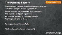 Her soft fingers are ideal for a piano reeds to make a classic musical note <br />But she struggles with hard steel and turn them into tools. <br />Sharpen tools go to the market and she comes home with a blunt heart. <br />She re-counts her small daily wage for her wedding dress <br />But her partner still fights to earn something. <br />In her fading dreams she hears the wedding bells <br />While the boy who writes his beautiful curriculum vitae to another World.<br /><br />nimal dunuhinga<br /><br />http://www.poemhunter.com/poem/sad-song-of-a-remote-village-factory-girl/