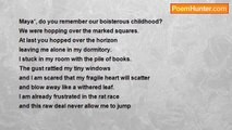 I listen in the quiet of the night to a faraway chirping of a bird. <br />She too awakes like me and I try to understand her austere song. <br />'Where's my Sweetheart and he's late tonight? <br />He promised me to bring sweetcorn, <br />Something happened to him or he flew in a wrong direction to some other roost? <br />I believe you and pray that you'll be all right, <br />And don't fly in the awful night. <br />I am awake till dawn until your safe return. <br /> <br />I dedicate this poem to the poetess Indira. Babbellapati<br /><br />nimal dunuhinga<br /><br />http://www.poemhunter.com/poem/hypochondria-2/