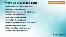 i cannot write when all is well <br />i need the grins that miss a tooth <br />i need the tolling of a bell <br />and for a little blackened truth <br /> <br />so sad the worlds bright today <br />so sad that words will never come <br />without a darker shade of gray <br />and the setting of the sun <br /> <br />but let this go this brilliant sky <br />this will not help me fill this page <br />and give me storms that never die <br />and i will write with brilliant rage <br /> <br />and leave me be this love you say <br />what will i write if all is well <br />i need a darker shade of gray <br />and distant tolling of the bell<br /><br />Ben Paynter<br /><br />http://www.poemhunter.com/poem/i-cannot-write-when-all-is-well/