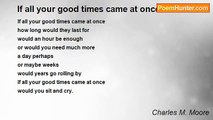 Only if, I wish <br />Only if, I could <br />Only if, I wondered <br />Only if, I would <br />Only if, I puzzled <br />Only if, I knew <br />Only if, It's possible <br />Only if, It's true.<br /><br />Charles M. Moore<br /><br />http://www.poemhunter.com/poem/only-if/
