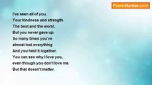 Please go away <br />You're hurting me <br />Your brutal fingers <br />leave purple streaks <br /> <br />I told a friend <br />About your violence <br />But she didn't believe me <br />Now I'm alone <br /> <br />The only place i can go <br />is home <br />to the pain you cause me <br />But it's too much <br /> <br />Soon, I'll be dead <br />with your marks on me <br />But the pain will end <br /> <br />I will be safe and warm <br />Loving arms will hold me <br />And the marks will fade <br />But only if one of us, goes away<br /><br />Angel Croshier<br /><br />http://www.poemhunter.com/poem/go-away-7/