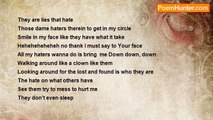 A Kiss To My Haters <br />A kiss to my Fans <br />My Haters <br />You Are my Biggest <br />Inspiration <br />My Haters You know <br />Who You Are <br />My haters talk so much <br />Drama their own mamma <br />Don't even what to hear it <br />They are all so lame <br />Full of envy and hate <br />Because I am the Queen of Me <br /> <br />Lilly Emery <br />Haters<br /><br />Lilly Emery<br /><br />http://www.poemhunter.com/poem/a-kiss-to-my-haters/
