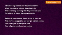 There is a goddess in my dreams, <br />An earthly woman so it seems. <br />I watch her in the clouds, <br />I see her in the trees, <br />I hear her in the pounding of my heart <br />and feel her in the trembling of my knees <br />She walks so proud and tall and strong <br />with hair like fire and smiles like song<br /><br />Poet Dragon<br /><br />http://www.poemhunter.com/poem/goddess-dreams/