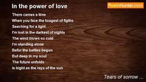 Not asking for the reat reason behind the sorrow <br />I embraced you tightly <br />But you left without a word <br />All I did was intensify my love <br />I'm so lonely that I can't sleep <br />The more I love <br />the tougher it gets for me <br />Even sorrow will turn into memories <br />I'll go with my life <br />As you did to yours<br /><br />Tears of sorrow ...<br /><br />http://www.poemhunter.com/poem/my-sorrow-2/