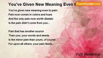 Pain you won't own, <br />Owns you, in the end; <br />The dark water comes <br />And you forgot how to swim. <br />Friends you don't owe <br />Try to lift you toward light- <br />But the moon stays the solitary <br />Sun, of the night. <br /> <br />Debts you won't pay <br />Try to sell you, each day; <br />Your heart on your face <br />Though you'd die, before saying.. <br />The hooks in your soul <br />Keep pulling you under- <br />And there's lightning in eyes <br />But a strange, silent thunder. <br /> <br />The vault will be silent <br />The grass will be still <br />When they put you away <br />For forever, to seal <br />The pain you were dealt, <br />And the debts left unpaid; <br />They will never be spoken- <br />For it’s now much too late.<br /><br />Patti Masterman<br /><br />http://www.poemhunter.com/poem/pain-you-won-t-own/