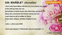 Wrong time, wrong place <br />Remember when it invariably seemed to be you <br />Others were more fortunate <br />Never you, never you! <br />Guess that’s the way you’ll always be… <br /> <br />The person in front, in the queue, <br />Instinctively bought the winning ticket <br />Money goes to money, you said <br />Every time you felt more of a loser… <br /> <br />Why worry about it, I say <br />Regrets just bring you down <br />Onwards and upwards, is my motto <br />Never look back, never frown <br />Get on with your life and you will find for sure… <br /> <br />Patience <br />Love <br />And <br />Common sense <br />Endure… <br /> <br />- <br /> <br />Colin J…28 April 2009... <br /> <br />(Don't ask where this came from, I don't know, but I think I was talking to myself...) <br /> <br /> *A Reminder About Copyright * © <br />If you want to use a poem from this site please make your request to: <A HREF='mailto: chippy49uk@yahoo.co.uk'>Contact Me by Right Clicking and Copy Email Address</A> <br />I will almost certainly say yes but this does me the courtesy of a request, and keeps the potential user from infringement of my copyright which is absolutely retained. <br />Thank you. Colin J...<br /><br />Colin Johnston<br /><br />http://www.poemhunter.com/poem/027-wrong-time-wrong-place-acrostic/
