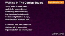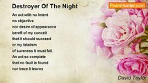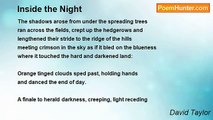 The shadows arose from under the spreading trees <br />ran across the fields, crept up hedgerows with ease <br />and lengthened their stride to the ridge of the hill <br />meeting crimson in the sky as if it bled on the blueness <br />where it touched the hard and darkened frill <br />of a tree laced horizon lying, waiting, strangely still. <br /> <br />Orange tinted clouds sped past, holding hands it seemed <br />as they danced to the music of the setting sun's scene. <br />A finale to herald darkness creeping, light receding <br />leaving only blackness tinged with a silver mooness <br />mingled with the grey-green grass' seaness. <br /> <br />Then the creatures of the night arose, <br />each with two points so bright <br />shining, gleaming, moving, stealing <br />through the shifting shadows <br />of the all embracing night <br />and flashing in and out of sight: <br /> <br />The wind sped past grasping, feeling <br />all that lay within its path <br />filled with shrill sounds of night. <br />How the branches creaked and snapped <br />and how the rushes swayed <br />on the rippled silver water, grey <br />and strangely sliding shapes were made <br />upon that dark and lonely unlit path.<br /><br />David Taylor<br /><br />http://www.poemhunter.com/poem/walking-into-the-night/