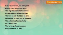 Today the sun shone, <br />the first time in many a day. <br />For weeks on end, <br />uncertainty has crossed the sky. <br />We have been tormented <br />by rain, floodwaters and swollen rivers. <br />We look out and wonder with anxious eyes. <br />We wonder if tomorrow <br />will bring another bright day, <br />just to brighten up our lives.<br /><br />David Harris<br /><br />http://www.poemhunter.com/poem/we-wonder/