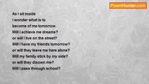 As I look I see my life before me <br />It flashes of how it used to be <br />A happy future but as I see the truth <br />I am scared. <br />I open my eyes. <br />A long road of nothingness is ahead for me.<br /><br />Carmela Kazmier<br /><br />http://www.poemhunter.com/poem/nothingness-11/