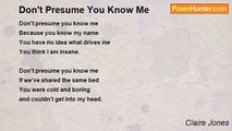 Don't ask me why I loved you <br />Don't look at me like I've changed <br />You made me this way <br />Killing me with your love. <br /> <br />So I like to go out <br />So I like to dance and have fun <br />So I talk to strangers <br />So I don't come home all the time. <br /> <br />Don't ask me why I loved you <br />When your on your own <br />Making me feel bad <br />For wanting to drink. <br /> <br />You took it from me <br />The light inside <br />Had to try and change me <br />Control me. <br /> <br />Why did you do that? <br />Can't remember who I am, who I was <br />Now you ask me why I've changed <br />You never did understand.<br /><br />Claire Jones<br /><br />http://www.poemhunter.com/poem/don-t-ask-me-5/