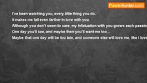I want to kiss him in the rain, be the one to take away his pain. <br />Care for him when he's feeling down. <br />Be the one to take away his frown. <br />Give him everything he needs in life. <br />I want to be the one he holds. <br />He gives me his jacket when I'm cold, he carries me when I can walk no longer, but all he wants is her. <br />Why can't he help my heart heal? <br />Why can't he see how I feel?<br /><br />Heather Hooper<br /><br />http://www.poemhunter.com/poem/i-want-to-kiss-him-in-the-rian/